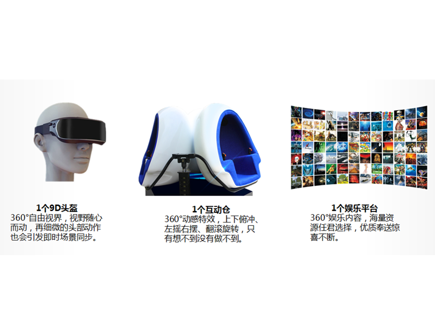 小空间大奥秘,动感舒适,完美同步。360°全景视角,1080P双眼独立高清分辨率,沉浸式9D头盔,让你坐在舒适的座椅上,就能游览从未到过的奇幻世界,独特的角度体验,享受不一样的视觉盛宴,随心随意畅游虚拟世界,探索未知世界的无穷奥秘,启迪智慧!