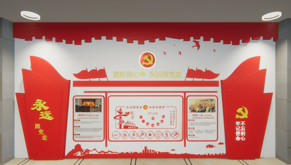 运用以AR互动为主的场地布置,凸显了庆祝中国共产党成立100周年的主题。场地的布置选用的是中国红,墙面上设计的文字介绍和图片,使场馆给人一种积极向上,拼搏奋斗之感。