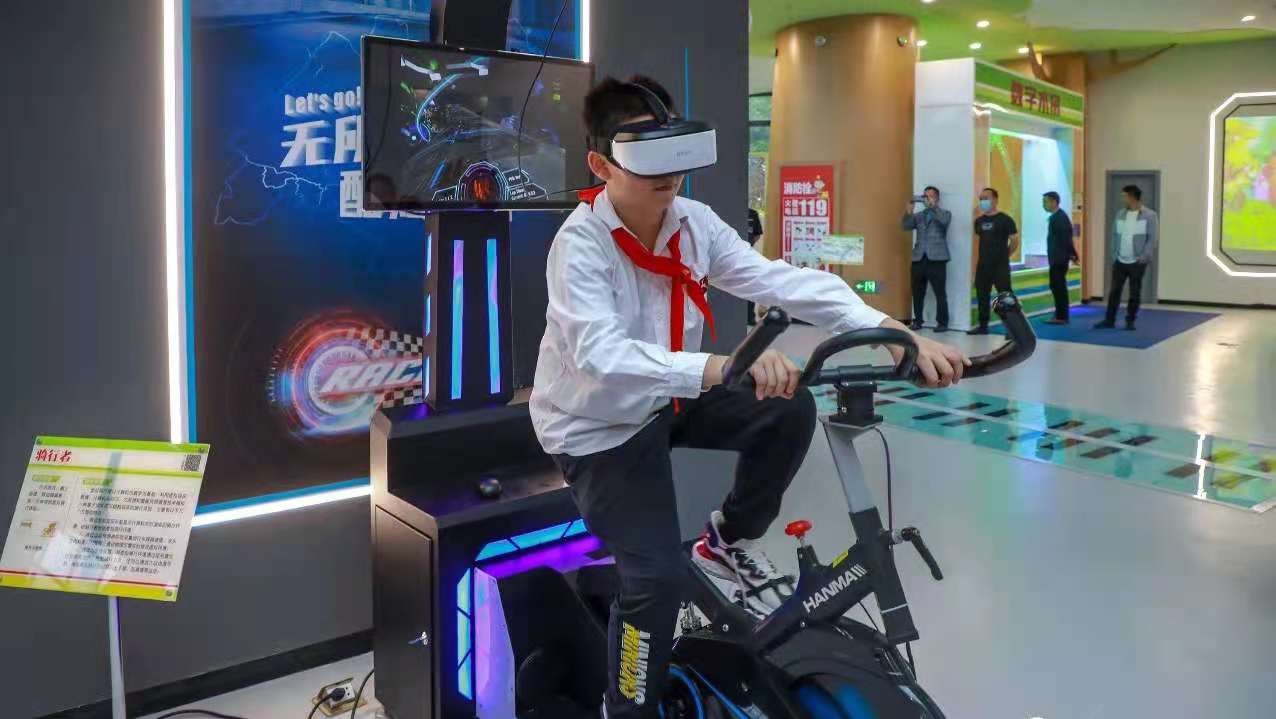 1、VR自行车。和传统自行车不一样的是,戴上VR眼镜,就能感受在不同场景下骑车的乐趣,在空中,在山间。玩转不一样的自行车骑行体验。