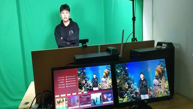 AR虚拟拍照系统是由直播系统而来,增加了体感动作内容,挥手切换不同展示内容,搭建一块绿幕,就能实现各种场景的任意穿梭。还有拍照上传功能,可支持用户下载自己在不同场景下的照片。